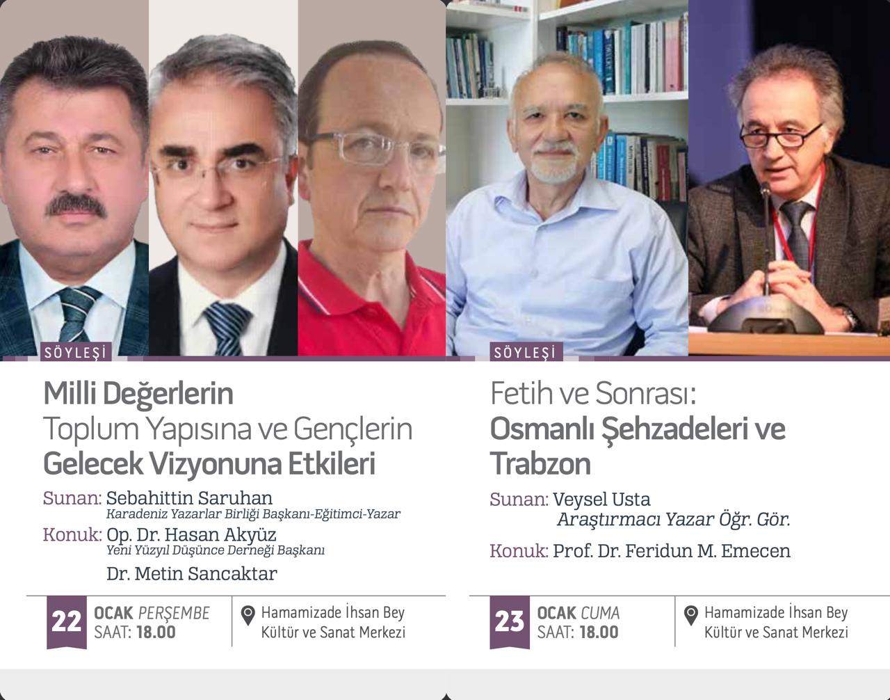Etkinlik programı seminer ve söyleşilerle de zenginleşecek. 8 Ocak Perşembe günü saat 18.00’da Prof. Dr. Ülkü Eliuz’un sunumuyla, Dr. Öğr. Üyesi Nuri Nalbantoğlu’nun konuk olacağı “Türkiye ve Trabzon’da Tiyatro Sanatının Güncel Durumu” konulu söyleşi gerçekleştirilecek. 19 Ocak Pazartesi günü saat 18.00’da Canan Kalaycı’nın sunumuyla, Trabzon Tüm Sivil Toplum Kuruluşları Federasyonu Genel Başkanı ve Gazeteci-Yazar Mustafa Durmuş’un konuk olacağı “Bir Şehrin Kimliği, Bir Şehrin Hafızası: Trabzon’un Sülaleleri ve Lakapları” başlıklı söyleşi düzenlenecek. 22 Ocak Perşembe günü saat 18.00’da Karadeniz Yazarlar Birliği Başkanı Sebahattin Saruhan’ın sunumuyla, Yeni Yüzyıl Düşünce Derneği Başkanı Op. Dr. Hasan Akyüz’ün katılacağı “Milli Değerlerin Toplum Yapısına ve Gençlerin Gelecek Vizyonuna Etkileri” konulu söyleşi yapılacak. 23 Ocak Cuma günü saat 18.00’da Araştırmacı-Yazar ve Öğretim Görevlisi Veysel Usta’nın sunumuyla, Prof. Dr. Feridun M. Emecen’in konuk olacağı “Fetih ve Sonrası: Osmanlı Şehzadeleri ve Trabzon” konulu söyleşi gerçekleştirilecek.