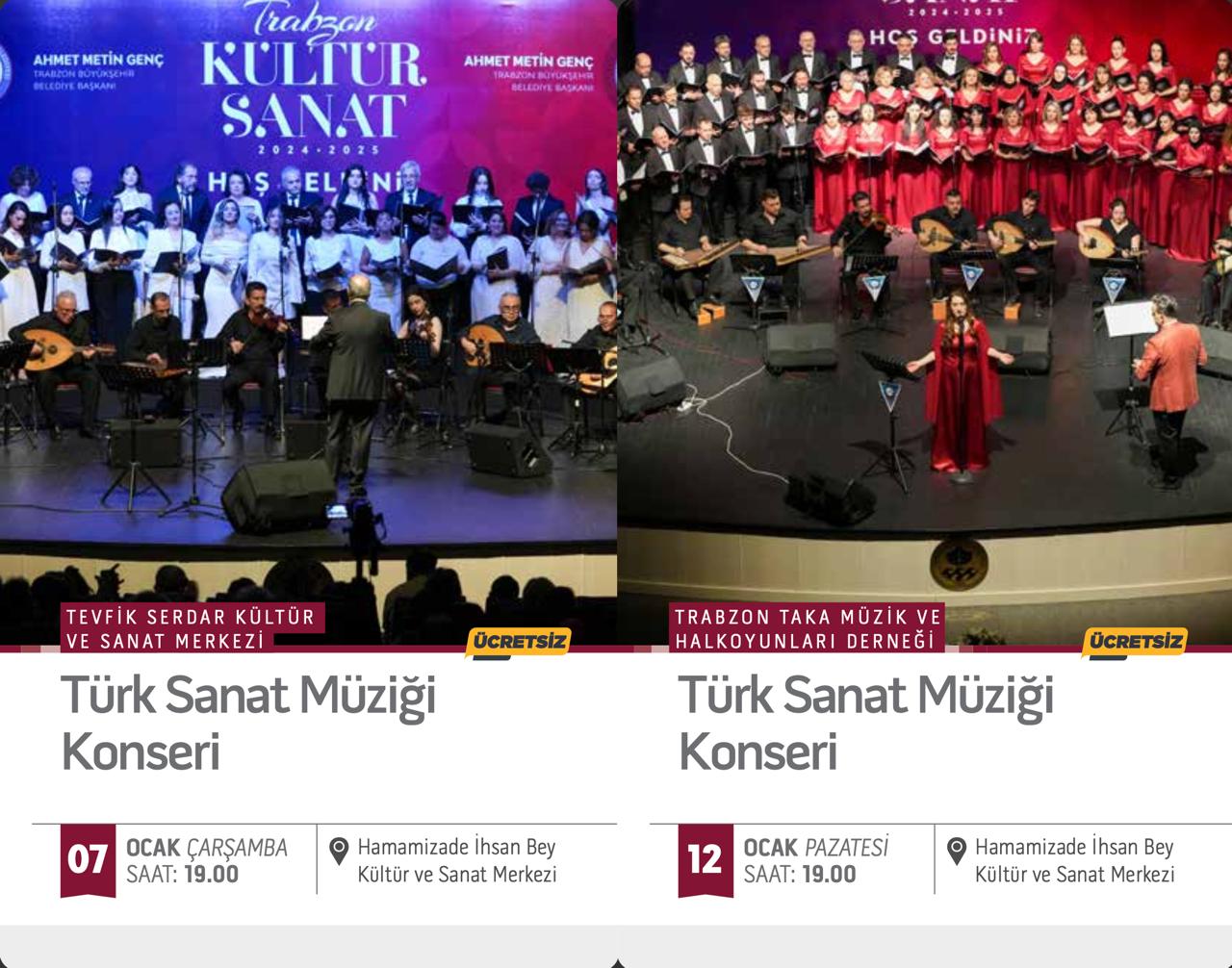 7 Ocak Çarşamba günü saat 19.00’da Tevfik Serdar Kültür ve Sanat Merkezi tarafından Türk Sanat Müziği Konseri düzenlenecek. 12 Ocak Pazartesi günü saat 19.00’da Trabzon Taka Müzik ve Halkoyunları Derneği tarafından Türk Sanat Müziği Konseri sanatseverlerin beğenisine sunulacak. 14 Ocak Çarşamba günü saat 19.00’da Akçaabat Kültür, Sanat ve Müzik Derneği tarafından Türk Sanat Müziği Konseri verilecek. 21 Ocak Çarşamba günü saat 19.00’da sanatçı Volkan Arslan’ın sahne alacağı Türk Halk Müziği Konseri düzenlenecek. 28 Ocak Çarşamba günü saat 19.00’da Trabzon Müzik ve Halkoyunları Derneği tarafından Türk Sanat Müziği Konseri gerçekleştirilecek. 15 Ocak Perşembe günü saat 18.00’da karikatürist Tamer Küçük’ün “Karadeniz İncelemeleri 2” adlı karikatür sergisinin açılışı yapılacak. 21 Ocak Çarşamba saat 18.00’da KTÜ TMYO El Sanatları Bölümü Dokuma Tablo Sergisi’nin açılışı gerçekleştirilecek.